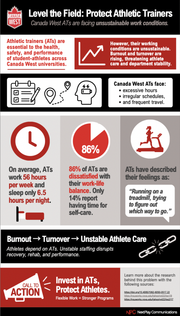 I created this policy brief and accompanying infographic to translate complex research on athletic trainer burnout into clear, actionable recommendations for Canada West decision-makers. These pieces were part of my progressive project for CMNS 3240 – Advanced Professional Communication.